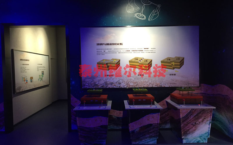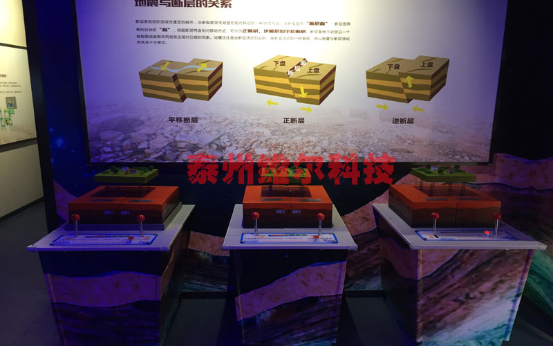 斷層對地面建筑的影響演示儀 綜述:展品采用模型提供一種演示構造地震發生時巖層正斷層運動、逆斷層運動和走滑運動的直觀演示,讓觀眾通過手動演示直觀地看到構造地震走滑斷層的形成過程和構造地震正逆斷層的形成過程以及對地面建筑物的破壞和影響。上盤相對于下盤發生下滑的斷層稱為正斷層;上盤相對于下盤發生上升的斷層稱為逆斷層。正逆斷層構造地震模擬演示器展品按照構造地震正逆斷層的特點制作形成正逆斷層的上盤和下盤,并在斷層上設置地表建筑物的模型,整個展品裝置在基礎平臺上,展品能同時演示正斷層運動、平移斷層和逆斷層運動。 技術參數及性能(配置)要求 1.性能要求: 1.1 放置三種斷層類型的模型,并在對應的墻面上方設置圖文燈箱對模型的內容作介紹(正斷層、逆斷層、平移斷層); 1.2 三種斷層模型,分別為(正斷層、逆斷層、平移斷層)。 1.3 斷層模型前段設置的操作桿為機械控制結構,觀眾搖動操作桿,對應的斷層模型就會產生相應的斷層類型的運動,直觀演示地震的成因。 2.配置要求: 2.1 模型演示臺 3個 演示臺主要有沙盤模型、臺體等組成。 2.2機械傳動機構 1個 由相關傳動機構組成,推動地面模型運動。 2.3 操作機構 1套 操作機構主要由手柄等組成。 2.4 材料要求:高分子復合材料, 有機板 δ10、木材δ18