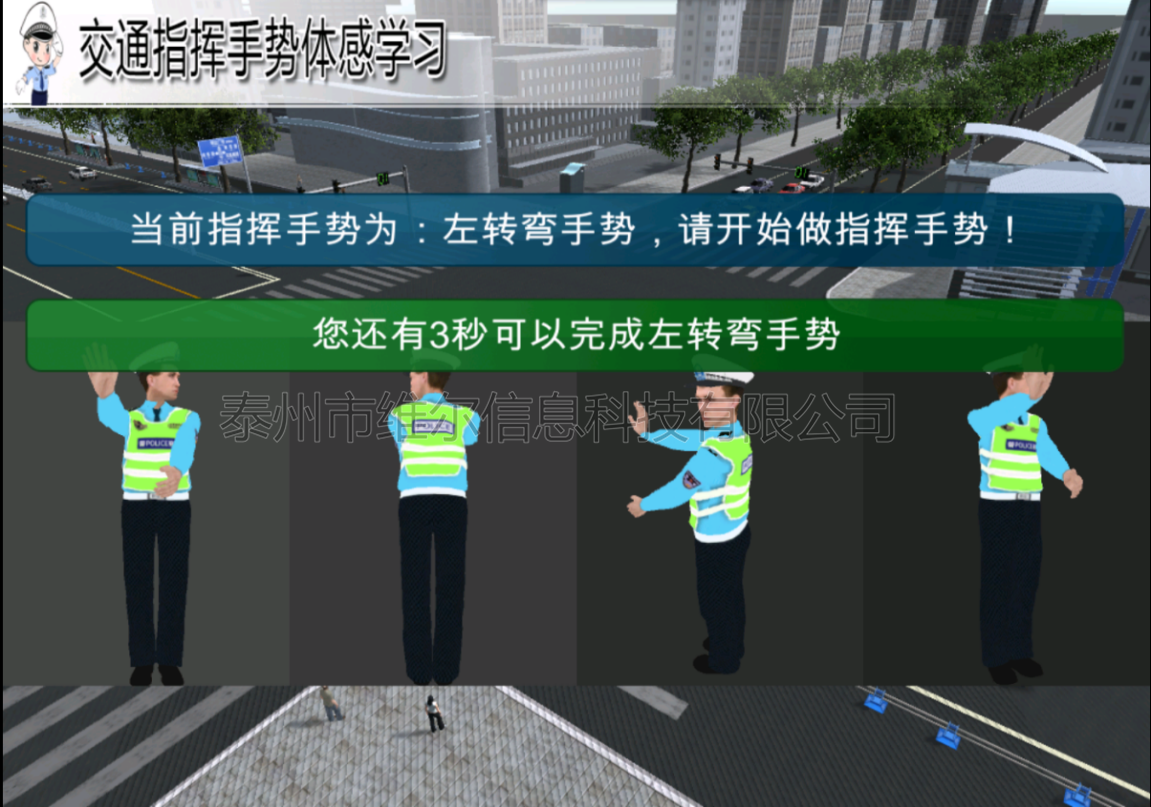 該系統(tǒng)是采用虛擬影像技術(shù),加入即時摳像功能,實現(xiàn)交通警察手勢指揮交通的全息展示。顯示屏直立入口處,畫面顯示穿著制服的交通警察,無人走過時,畫面為交通警察面帶微笑靜止不動,當(dāng)有人走過或靠近時,交通警察會根據(jù)紅綠燈信息做相應(yīng)手勢指揮交通。 交警指揮手勢模擬游戲 游戲開始時,畫面上卡通交警依次顯示做指揮手勢的畫面,分別是:左轉(zhuǎn)彎、停止、左轉(zhuǎn)彎等待、右轉(zhuǎn)彎等待、右轉(zhuǎn)彎、變道、減速、靠邊停車、直線,同時會有相應(yīng)語音提示。體驗者在感應(yīng)區(qū)域中模擬交警的手勢,同時程序會通過kinect去識別,在規(guī)定的時間內(nèi)依次完成模擬進(jìn)行手勢學(xué)習(xí),最后系統(tǒng)給出評分。每一輪游戲結(jié)束間隔5秒后,系統(tǒng)會自動開始下一輪游戲。