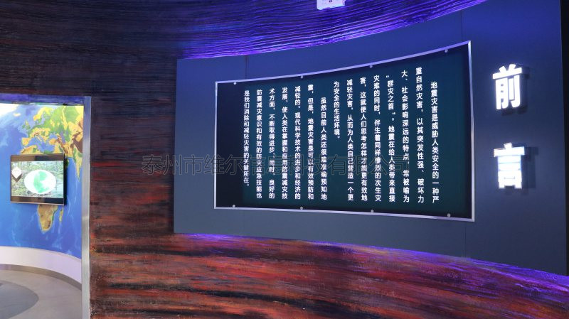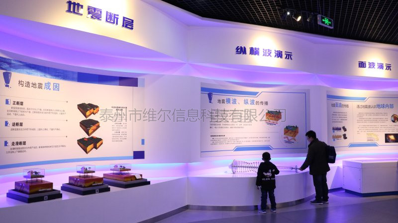 本科普教育基地共分為序廳、地震知識展區、防震減災展區、互動體驗展區及尾廳五個功能展區。